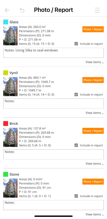 Visualize your project organized by materials. Edit all the information you need and generate instant photos and reports.